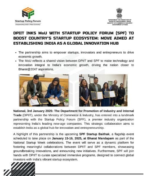 DPIIT inks MoU with Startup Policy Forum (SPF) to boost country's startup ecosystem